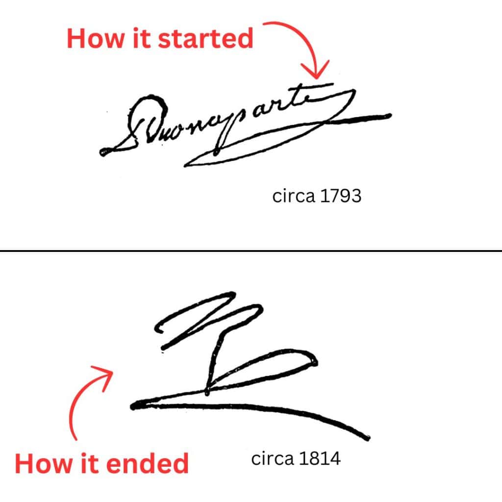Now, fast forward to his final bow in 1815. His signature’s decline is as dramatic as Napoléon’s own life story.